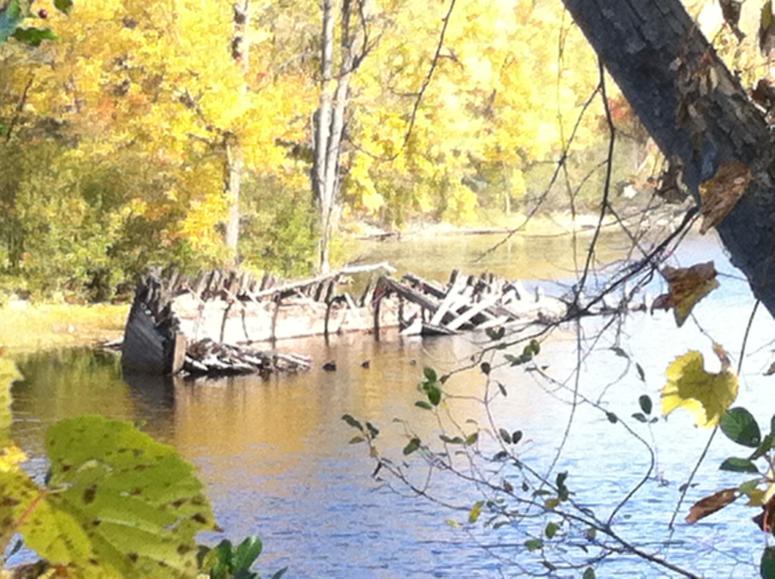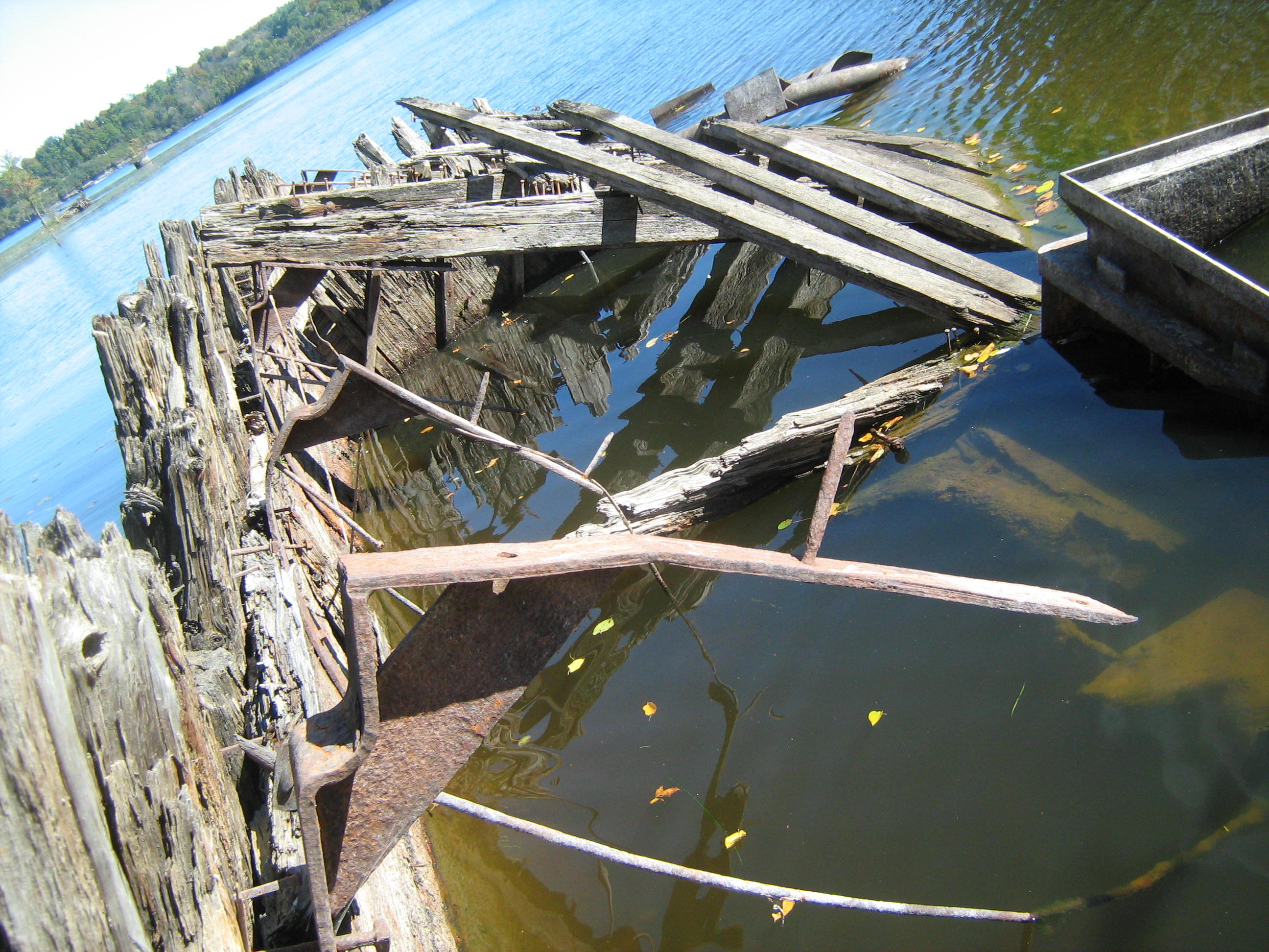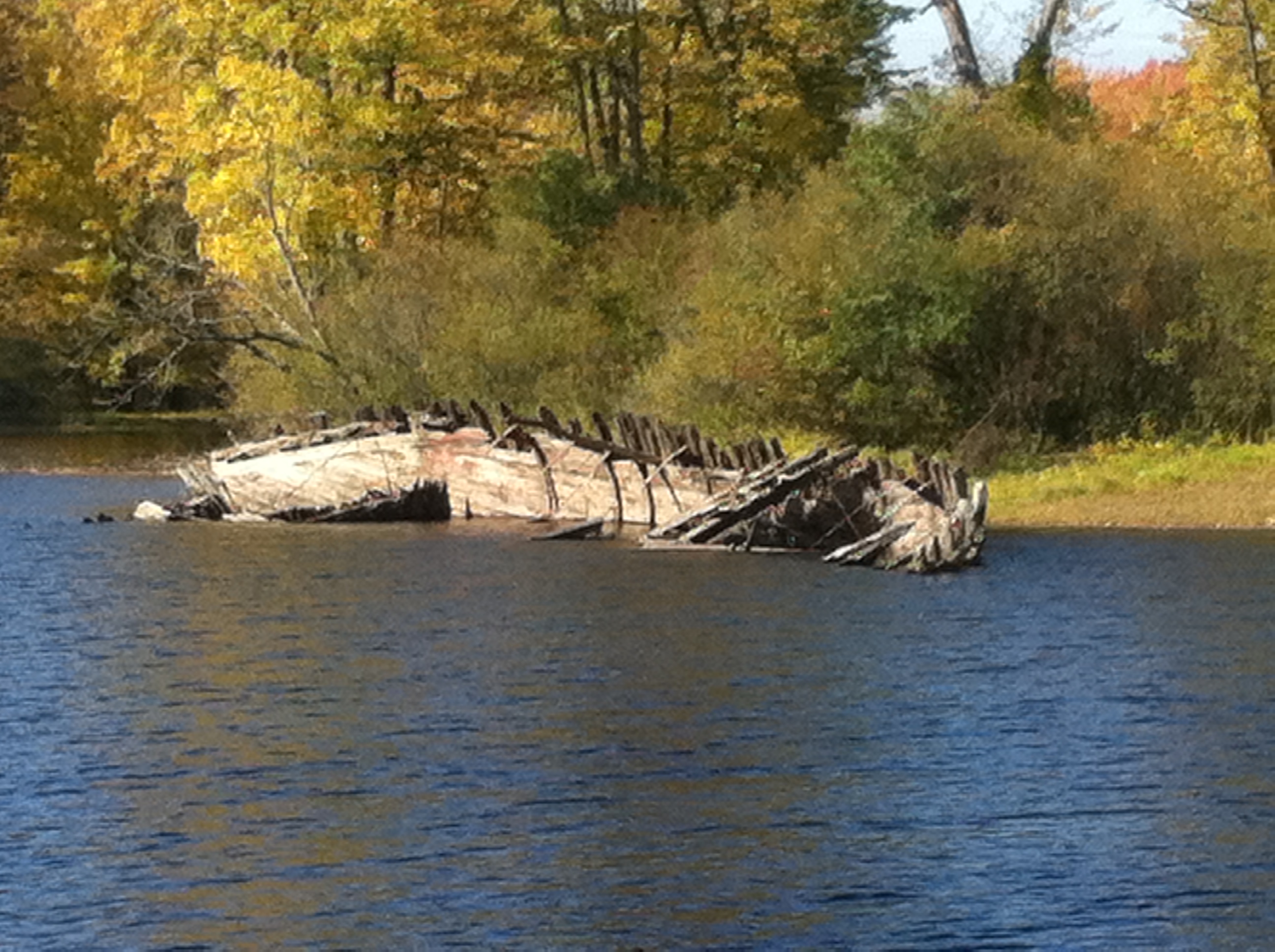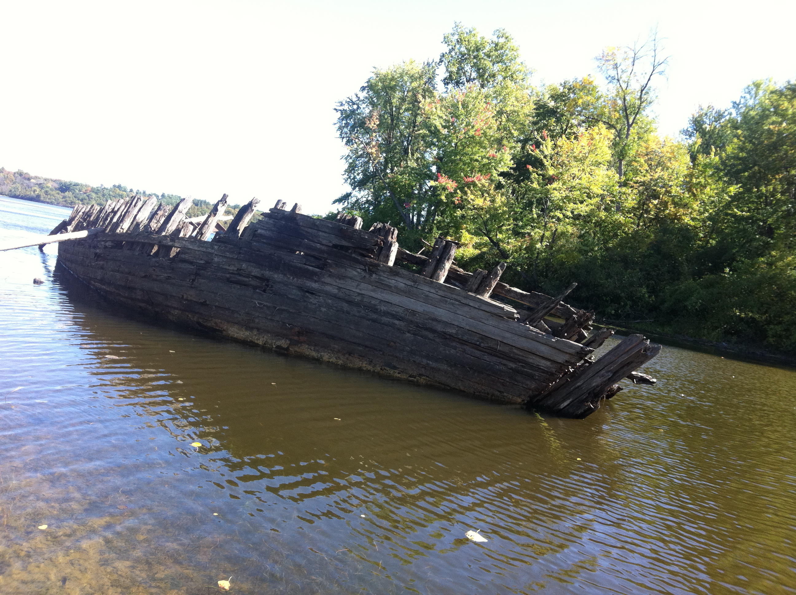 Heading into the woods near the shore of the Ottawa River we used an iphone mapping system to pinpoint where the remains of this possible wreck would be. A gorgeous, sunny warm fall day, we trudged through thin brush and following a small path, hiked in about 20 minutes from the nearest road. Pushing aside some branches at the river’s edge we stumbled across a magnificent scene….a half submerged, 100 foot wooden hulk of a shipwreck.