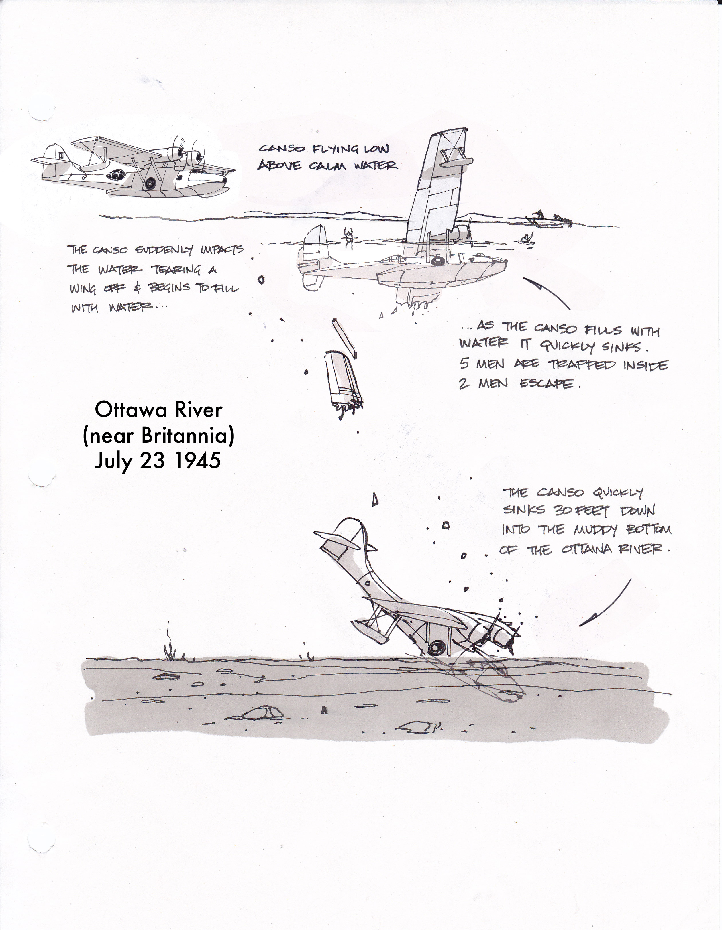 As cottagers sipped lemonade on the shores of the Ottawa River near Britannia on a hot July afternoon, relaxation turned to terror as they witnessed the tragic crash and sinking of a 100 foot flying boat. Five of the seven man crew perished that warm summer day as their flying boat quickly sank under the glassy surface of Britannia Bay. Trapped inside the sinking hulk of the Consolidated PBY-5A Canso, it would only take five minutes for the men inside to be taken to their watery grave at the bottom of the Ottawa River.
