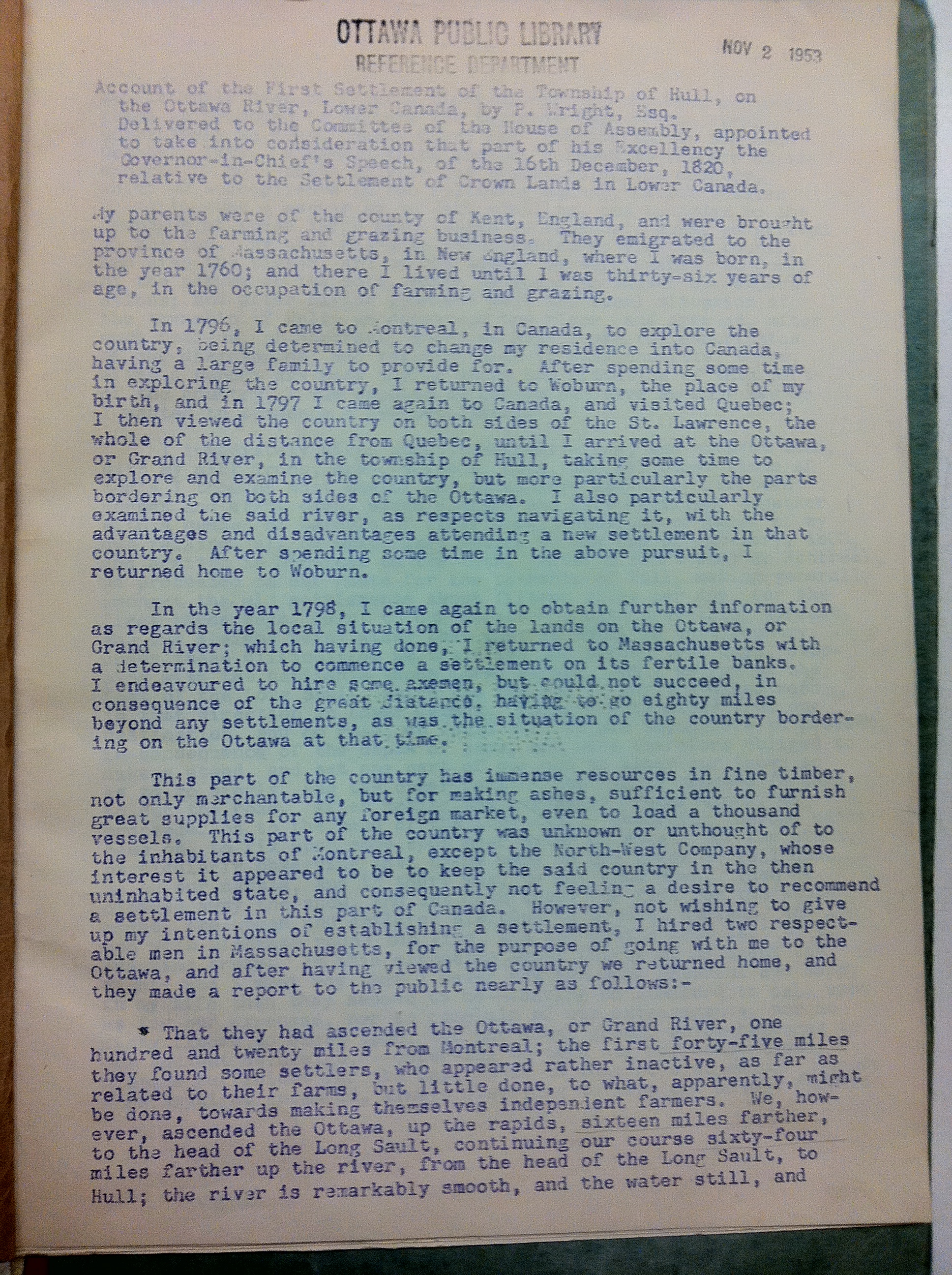 “Account Of The First Settlement Of The Township Of Hull, On The Ottawa River, Lower Canada”. By Philemon Wright, 1820. Ottawa Public Library.