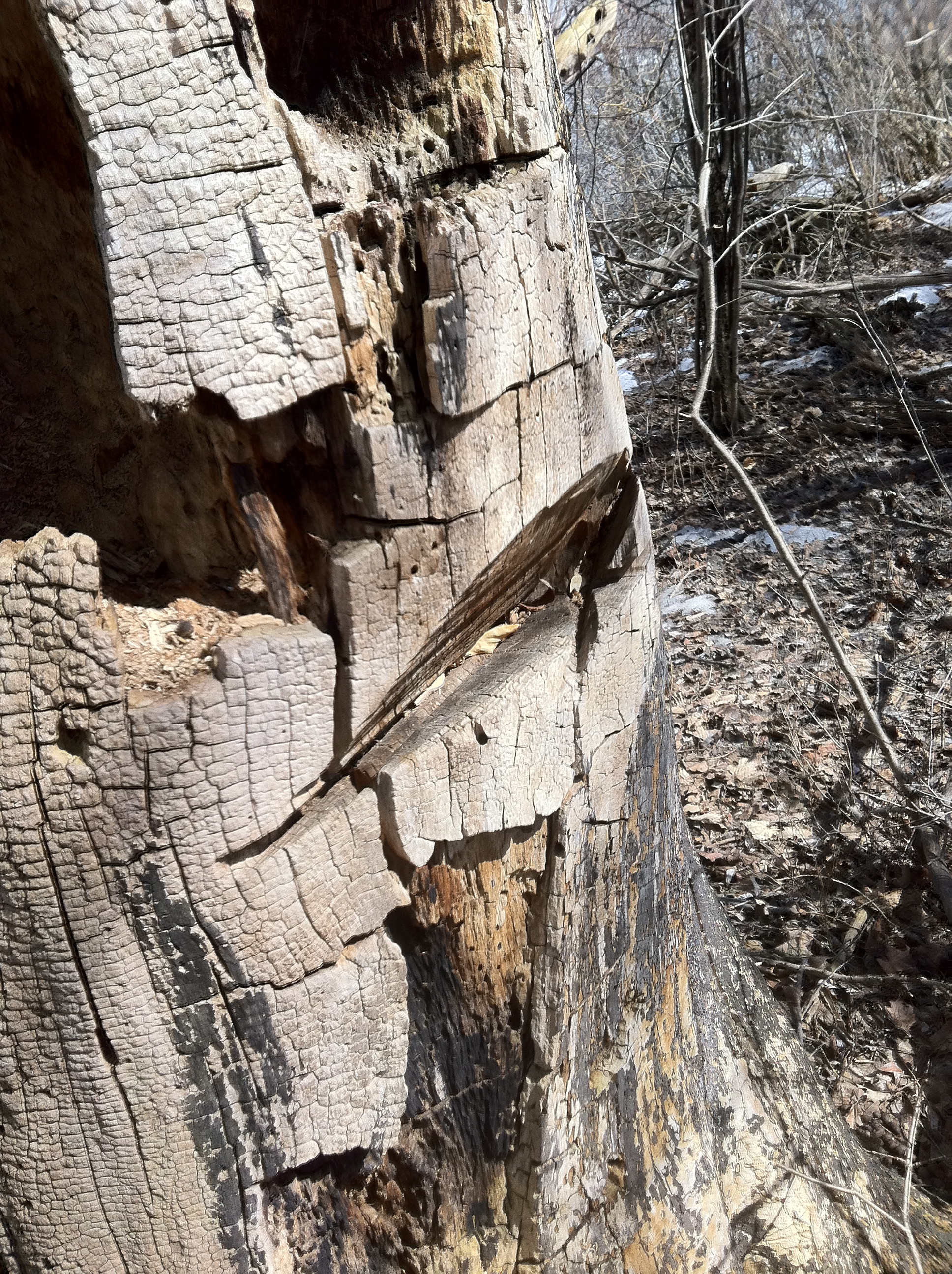 An overgrown trench had been previously dug across the area, which is a common archeological technique when investigating a site. Axe marks were found on large, dead trees in the vicinity. Whether these are from 1800 when Wright’s axemen were clearing the land, or recent chainsaw marks has yet to be determined.