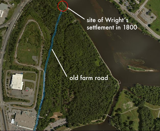 So now that we know where Wright landed and built his log cabin, what is left, if anything, of this original settlement? Old maps show his land and Columbia farm, and the original farm road is still in existence, although abandoned. The majority of Wright’s settlement is on NCC land at Lac Leamy Park in what is now Gatineau. The original Wright farm road, which led from his original log house to his prosperous mill over by Chaudiere Falls partially remains, but what of the original cabin from which the road led to?