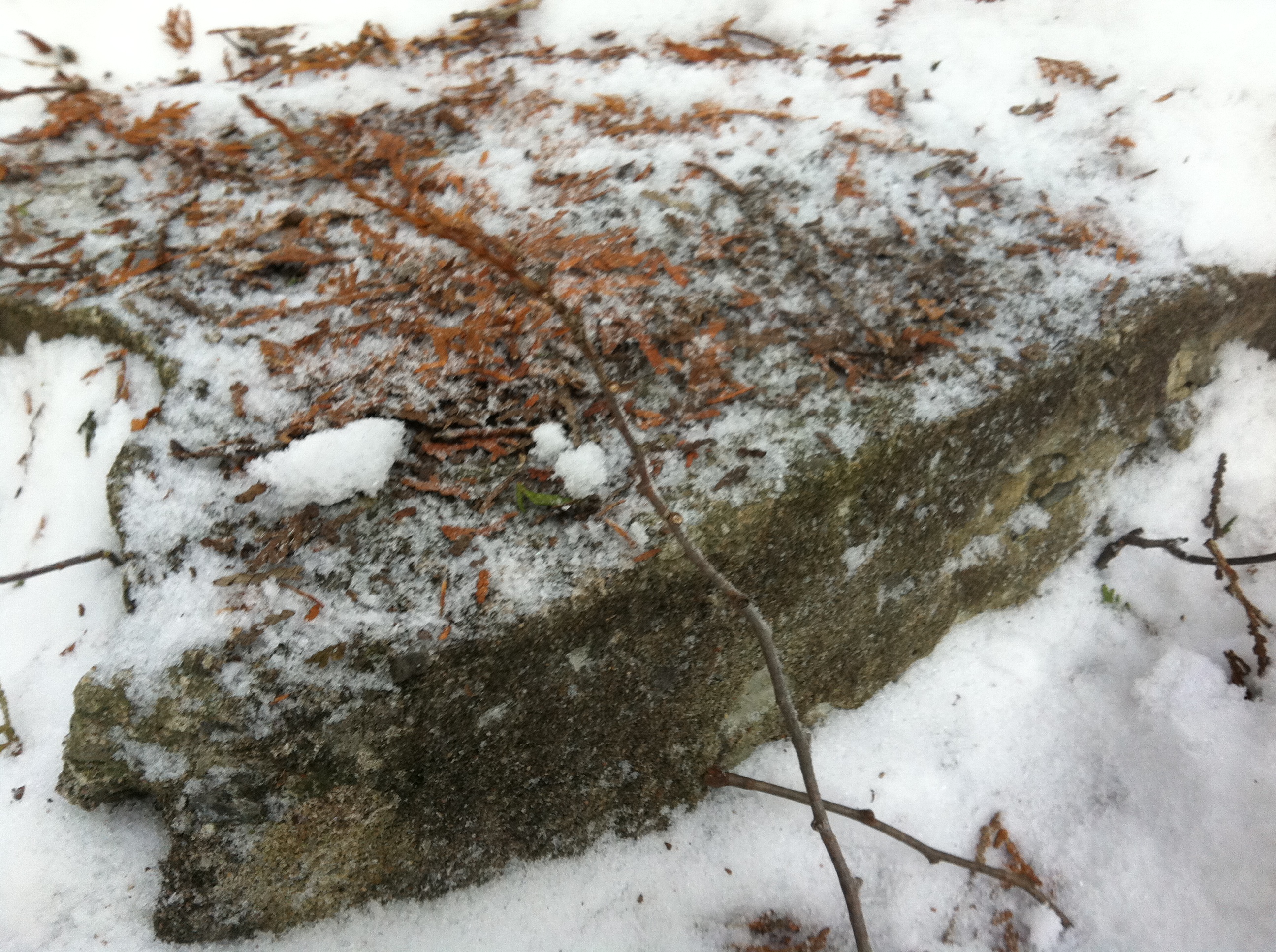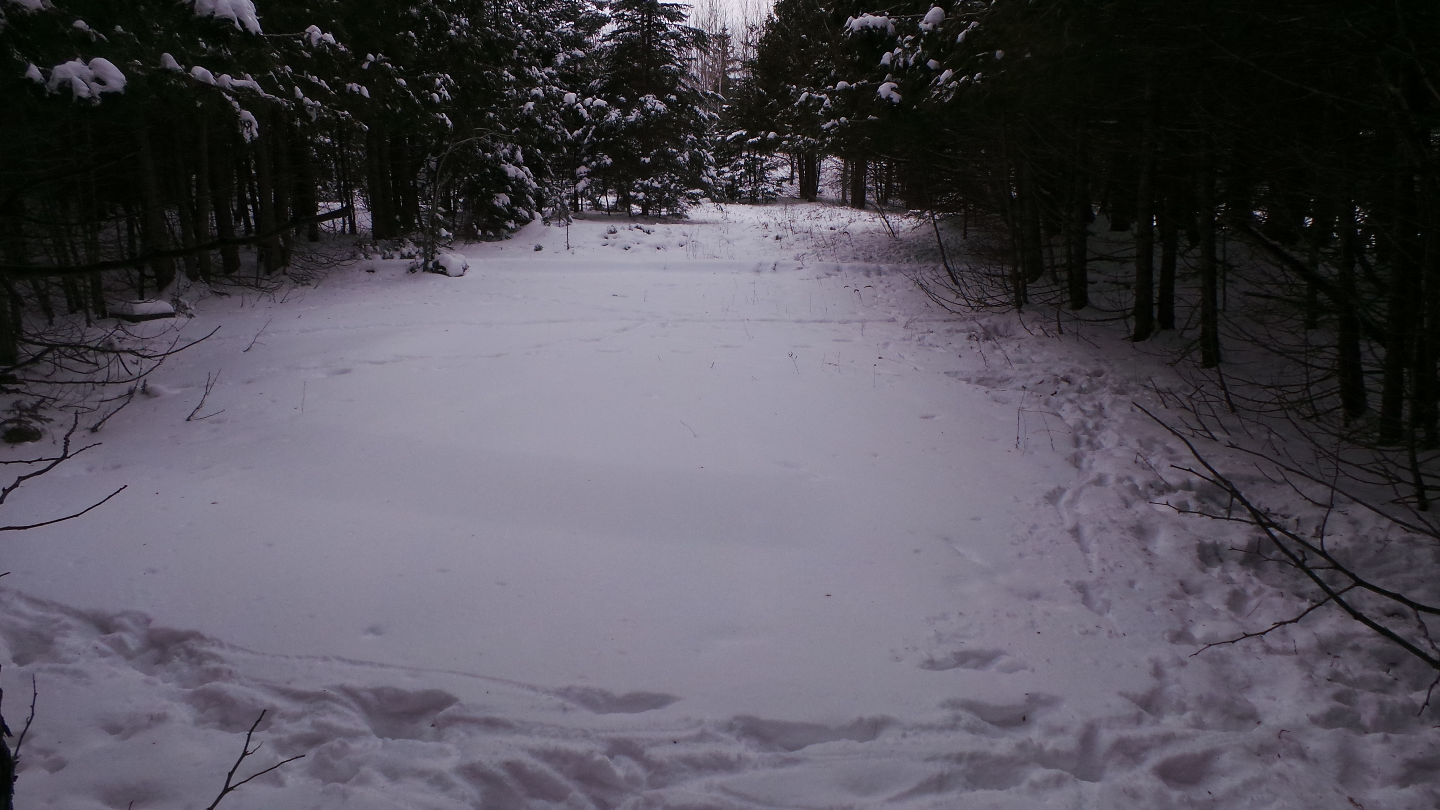 The 1965 aerial image of the Cedarview Motel showed it once had an in-ground swimming pool, a feature filled in as shown on the 1976 image. Stumbling through the deep snow we soon came across a clearing with absolutely no vegetation growing on it. Was this the filled in swimming pool? Overgrowth had consumed the Cedarview Motel area, but for some reason, this area was devoid of any trees, which I think would be because the trees would not be able to take root within an in-ground concrete swimming pool.