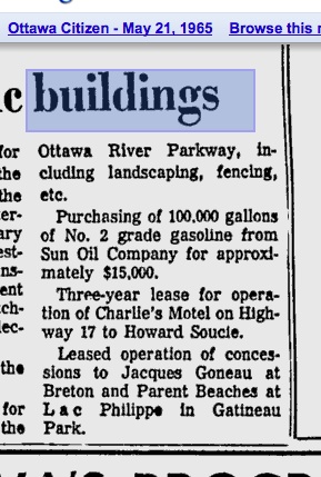 With both motels now known and identities confirmed, a further search history showed that both motels were later purchased by the National Capital Commision who bought the properties, left them abandoned, which later resulted in the Cedarview burning to the ground, and Charlie’s being demolished. An Ottawa Citizen article from 1965 shows that the NCC had at that time purchased the land and was leasing it to Charlie’s Motel proprietor Howard Soucie for a three year contract.