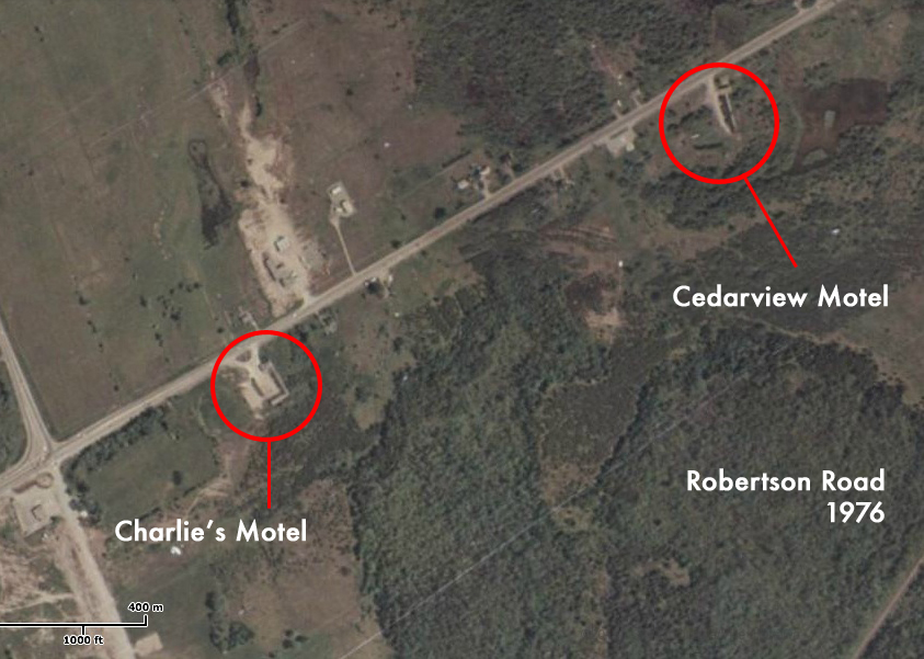 A 1976 aerial image shows both were still in existence at that time, but a 1979 Ottawa Journal article and photo shows that the Cedarview burned down. It is not known when or how Charlie’s Motel met its fate.