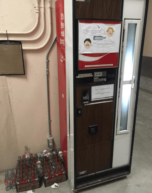 During the 1980s the machine was updated from the 1960s machine, but instead of dispensing easier to handle aluminum cans of Coke, it was replaced by an 80s machine that was designed to maintain the tradition of spewing forth ice cold glass bottles of Coke as it originally did in the 1960s.