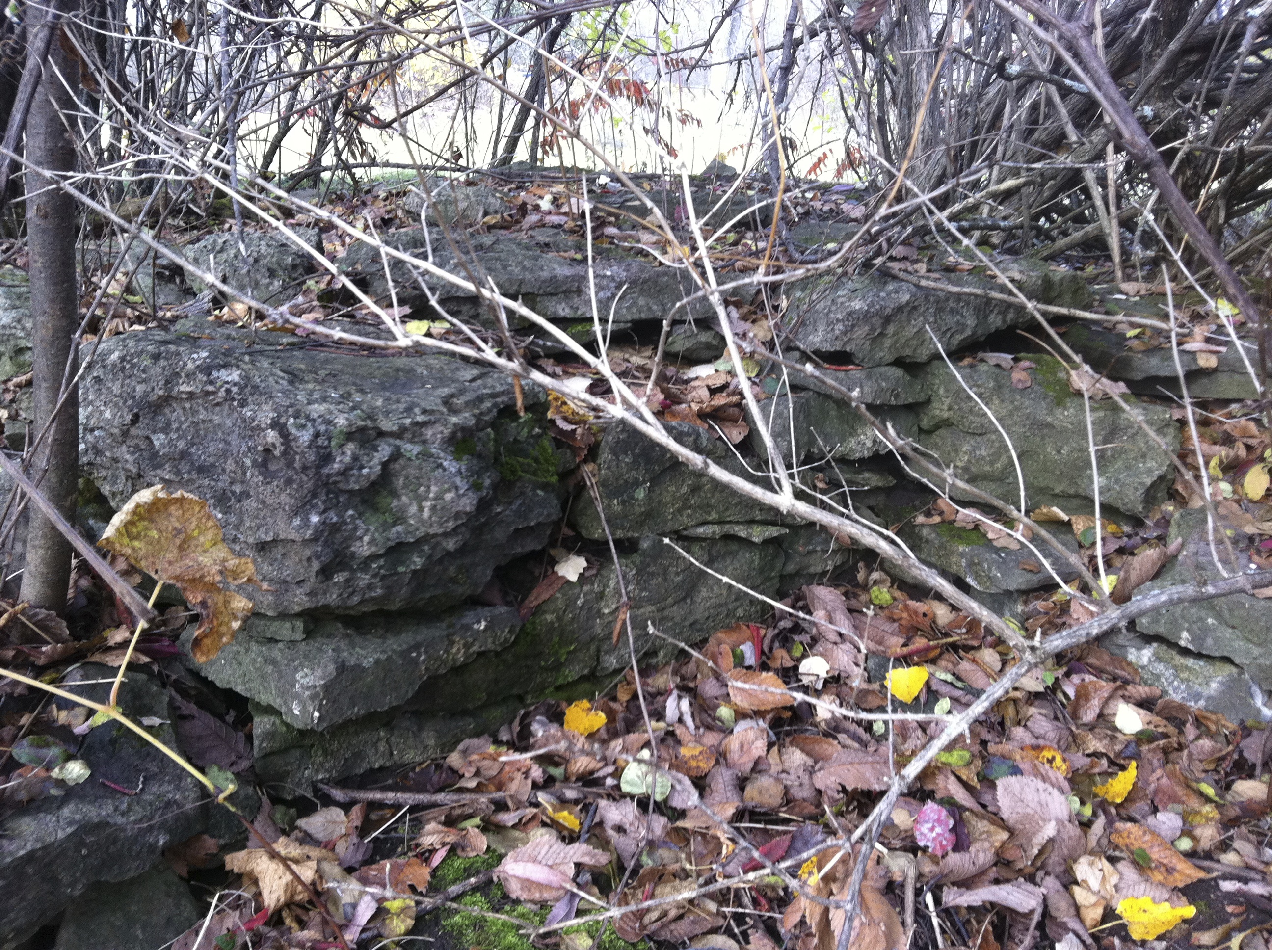 Concealed under the cover of bushes and underbrush, the original stone foundation of a structure is visible. This is most likely the remains of Mondions original home he built in 1786, the oldest known settlement in the Ottawa Valley, and later a busy trading post.