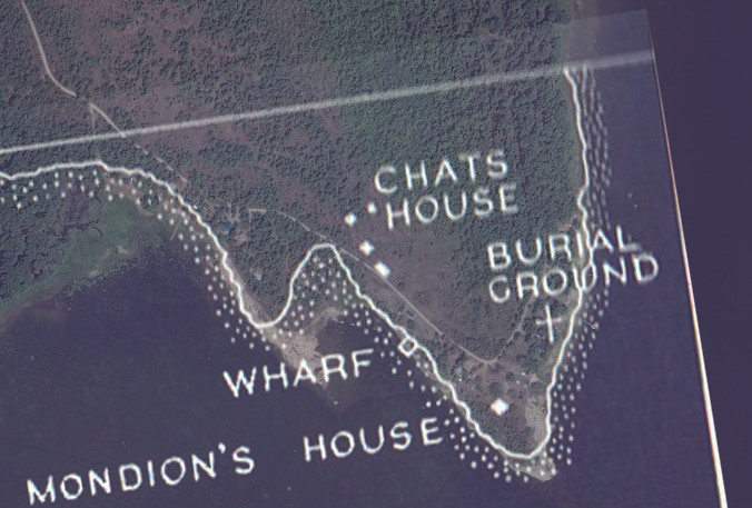Another map from 1845 indicates where Mondion’s original 1786 house would have been. Some cottages are built on a burial ground. (Source: The Upper Ottawa Valley by Clyde Kennedy)