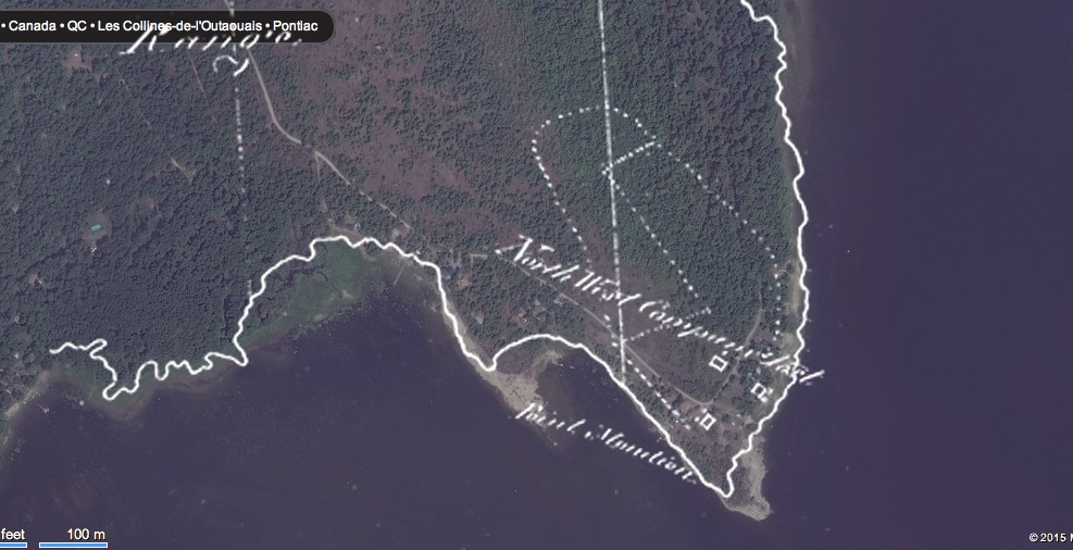 In an effort to locate this once prosperous 200 year old Hudson’s Bay Trading Post I referred to an 1805 map by the Northwest Trading Company that outlined where the original structures would have been. Transposing that map on a current aerial view map indicated where any ruins may lie today.