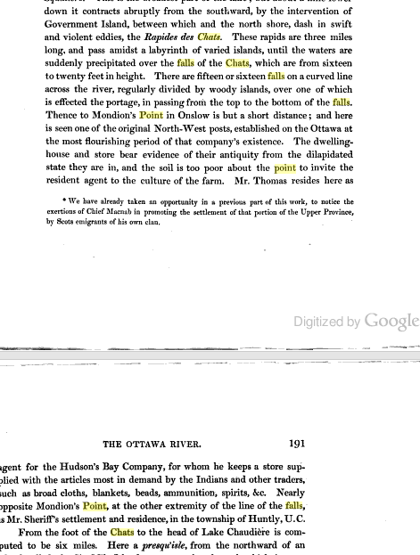 A description of the trading post at Mondion Point from an 1832 publication entitled “British Dominions in North America” by Joseph Bouchette. Note “spirits” for sale. SOURCE: Google
