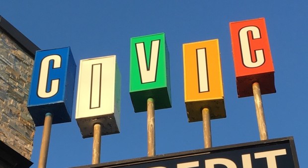Since the word “CIVIC” is a palindrome (a word which reads the same backward as forward) it was made into a rotating sign, with each letter rotating, and being able to be read from any viewing position. The rotating letters of the sign required much maintenance, and it stopped rotating at some point.