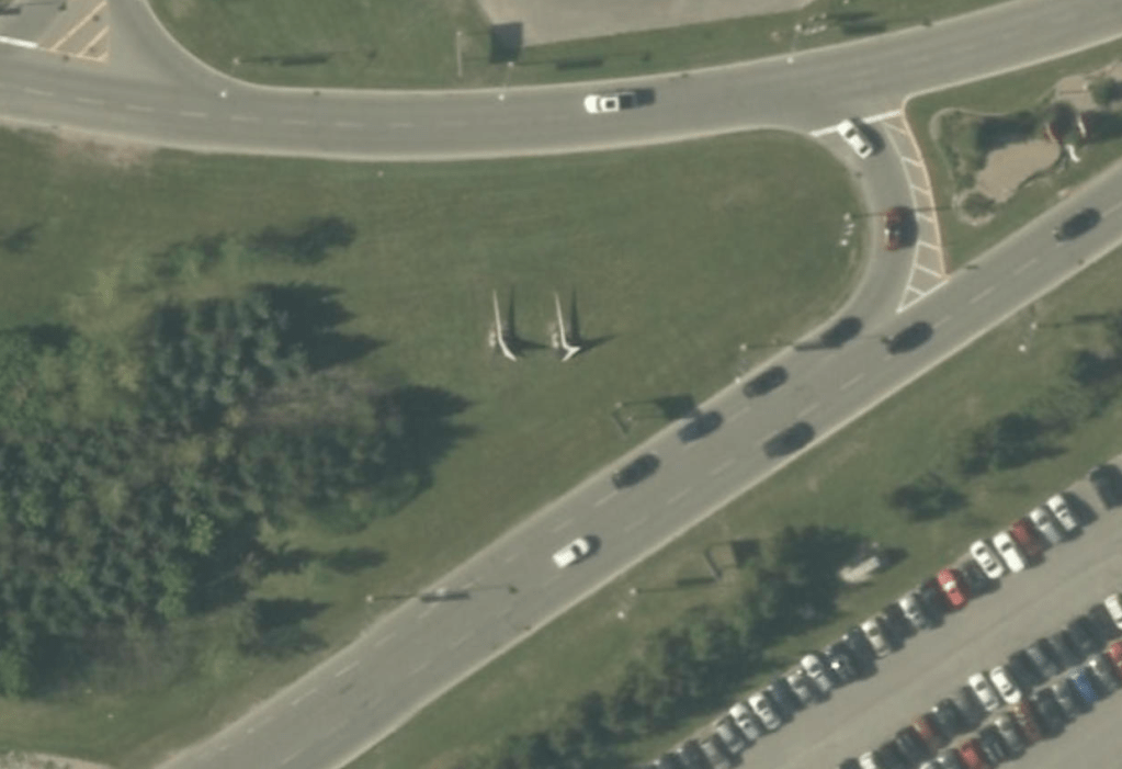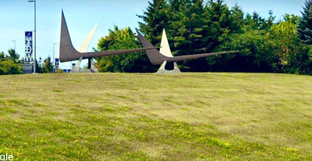 Constructed from sharp edged curved aluminum, the goose sculpture remained at Ottawa’s airport terminal until it was renovated in the late 1980/90s when they disappeared until the latest renovation occurred. Re-opened in the early 2000s, Shape Of Flight returned to the main entrance of the airport on the grassy knoll, visible as travellers enter the stunning new terminal.