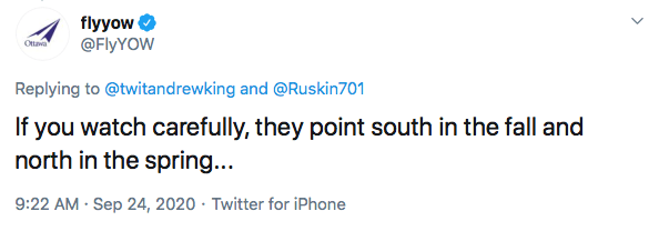 The Airport Authority quietly switches the goose sculptures to face the north in the spring to recreate the Canada Goose migrating back from the south, and in the fall switches the sculptures to face south when the real geese head south for the winter.