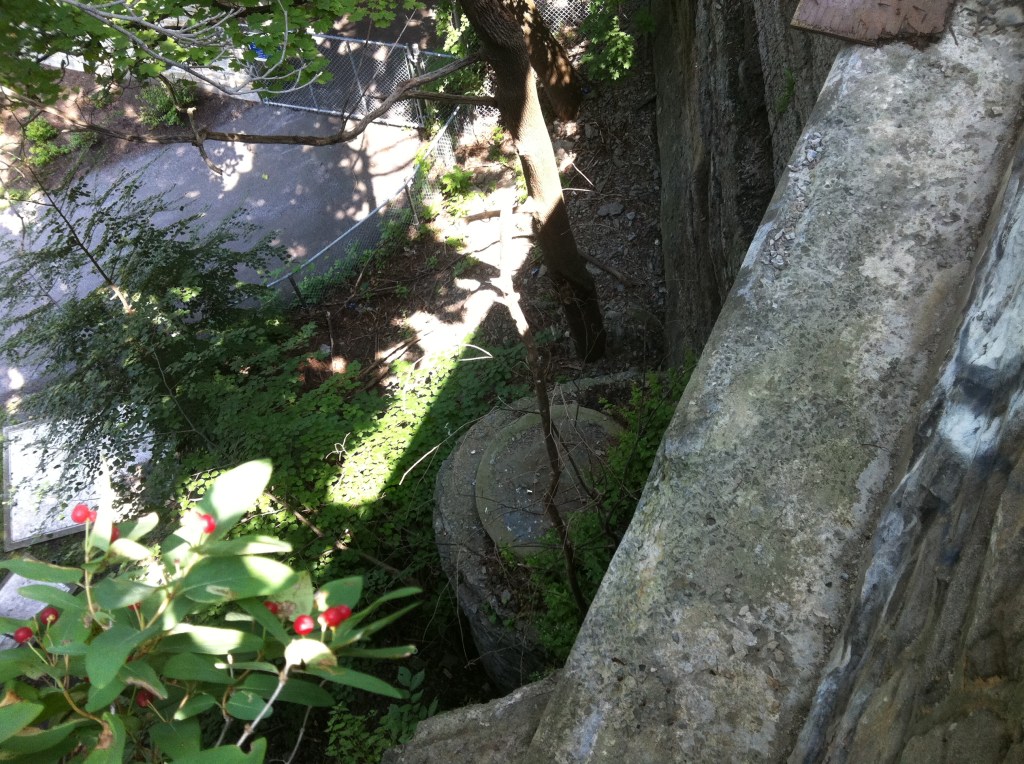 An exploration of the area found it is overgrown and fenced off in most parts, but behind some shrubs an old stone and mortar structure rising from the base of the cliff about 15ft up its face was visible accompanied by the sound of rushing water.