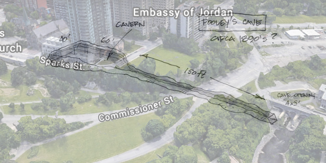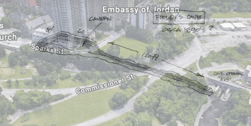 Before the National Capital Commission “re-imagined” downtown Ottawa in 1960 and started terraforming the historic downtown core of the city, there were a number of unique elements that have sadly been lost forever. The entire neighbourhood of LeBreton Flats was expropriated and demolished without a trace. The “Park of The Provinces” was built over what was once Brading’s Brewery. And just around the corner from that was a remarkable natural feature of a cavern that stretched east under Sparks Street for apparently more than 200 feet all the way to Christ Church Cathedral. This legend originated from the 1800’s and described a “natural wonder” and a room of stalagmites and stalactites that were “beautiful beyond description”. But not a single mention or trace exists today of this incredible underground feature in the heart of the Nation’s Capital. So, I thought we should look for it.