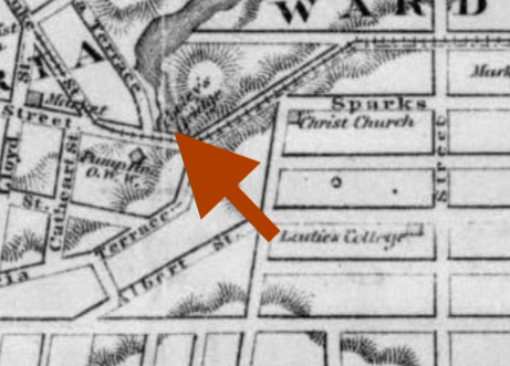 Upon entering the cave, a natural tunnel headed in an easterly direction towards Christ Church Cathedral. Traveling 75 feet in a stooped position through the tunnel, it was then said that one had to go on hands and knees for another 40 feet. Here, the tunnel widened into a room about 40 feet by 60 feet where stalagmites and stalactites appeared. Other descriptions mention a running waterfall inside the cave. So, this all sounds pretty cool but where would this be now and would it still possibly be there?