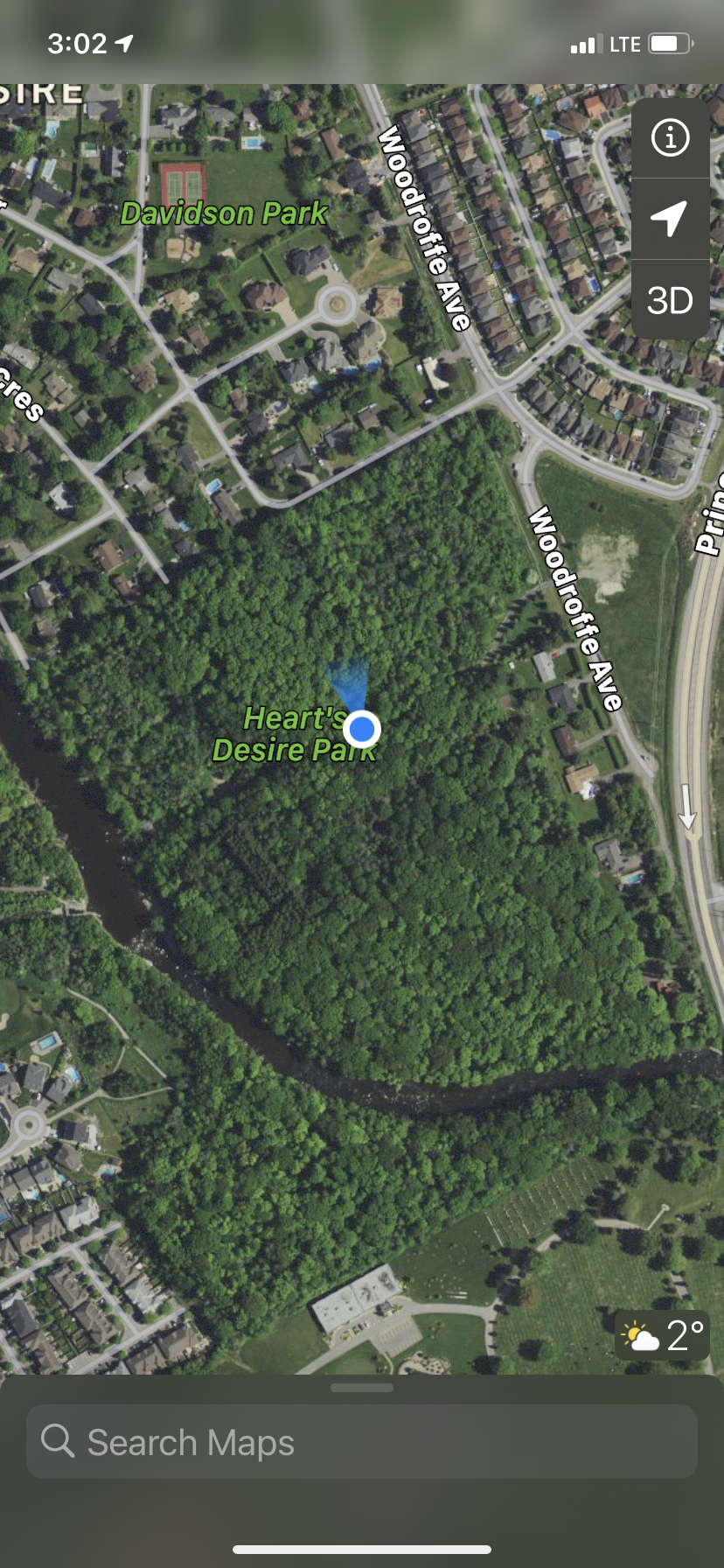 The area in question is a slice of land called “Heart’s Desire Park” and is maintained by the City Of Ottawa at the southernmost end of Woodroffe Avenue at Prince Of Wales Drive. Being surrounded by heavily developed Suburbia, I wondered why this slice of prime land escaped development, a beautiful forest on the banks of the Jock River.