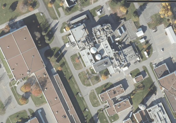A recent satellite image shows the Top Secret Balls still in place, now surrounded by other buildings and obscured from view on the ground. (Image GeoOttawa)