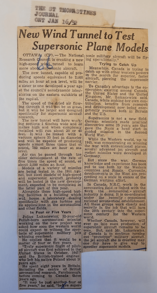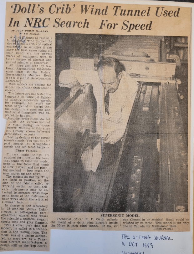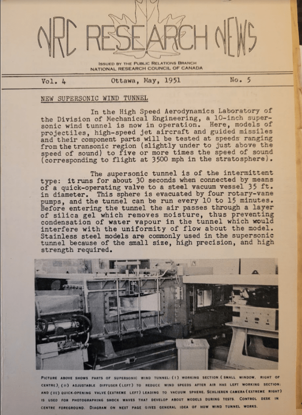 A newspaper article from the 1950s describing the new wind tunnel facility in Ottawa. (image Emma R. Collection)