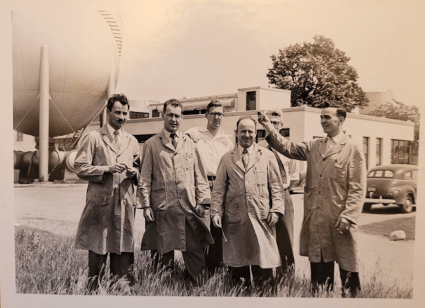 A group of scientists that worked on the top secret wind tunnel experiments for the Avro Arrow with the newly constructed Large Vacuum Balls in the background. (image courtesy Emma R. Collection)