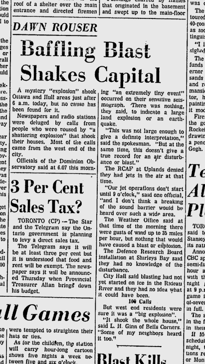 Back in the 1950s a mysterious large explosion was heard in the West End of Ottawa, and one of the suspects was Shirley’s Bay. A “Baffling Blast Shakes Capital” headline tells a story of an early morning explosion that shook houses across west Ottawa and Hull. The Defence Research Board at Shirleys Bay denied any knowledge of an explosion and the large blast was deemed a “mystery”.