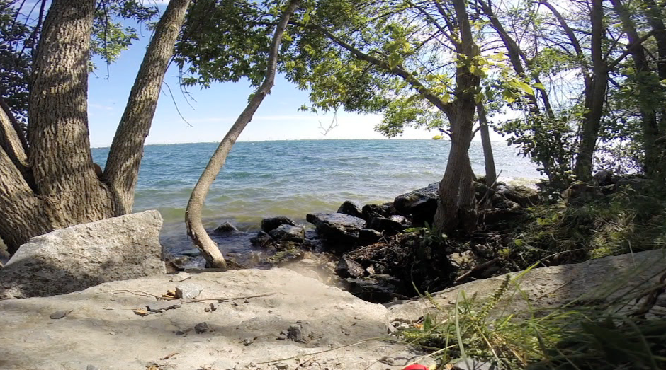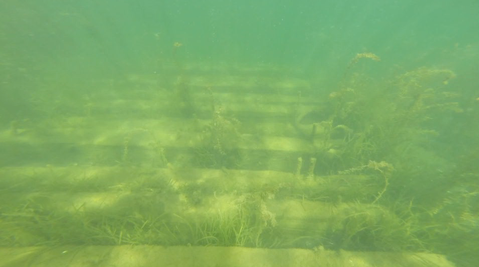 After two hundred years of decay and neglect, not much is left of the once grand ship, a line of old wooden ribs form the outline of the ship that lies on the lake bottom in about ten to fifteen feet of water. Protruding iron fasteners are visible among the encroaching weeds. After I swam and filmed the entire length of the shipwreck I tried recording what I could of this important Canadian relic. Private waterfront homes and a seawall surround the wreck site, with the hulk of the ship hidden below the waves, out of sight and decaying on the lake bottom.