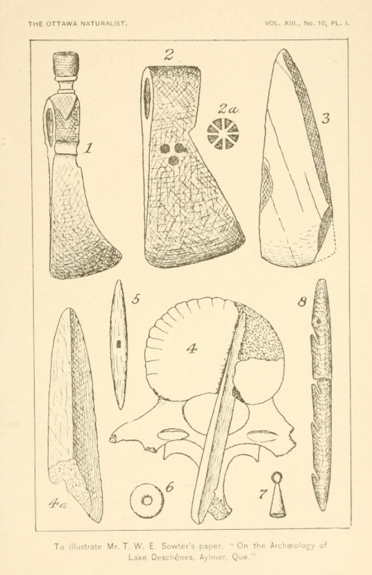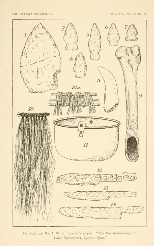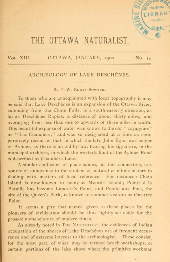 Our story begins with my recent research into the history of the Ottawa River, a history that I’ve recounted before through articles written about centuries old ruins, forgotten French forts, trading posts, shipwrecks and other incredible historical evidence that the Ottawa River was once an important conduit of goods and people. It was when I was researching the old lighthouses of the Ottawa River that I came across a most intriguing document from 1899 called the “Ottawa Field Naturalist” with an article within its pages entitled “Archeology of Lac Deschenes” by a T.W. Edwin Sowter.