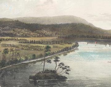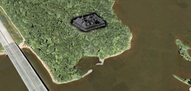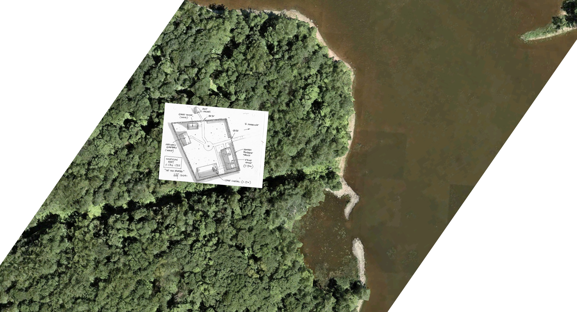 Stone piles suggest a foundation for a wooden palisaded fort that contained other buildings as well. But what was it? A search of old maps of this area turned up an interesting drawing of some kind of fort on the island, which would substantiate the unearthed stone ruins on the island, but who constructed such a structure and when?