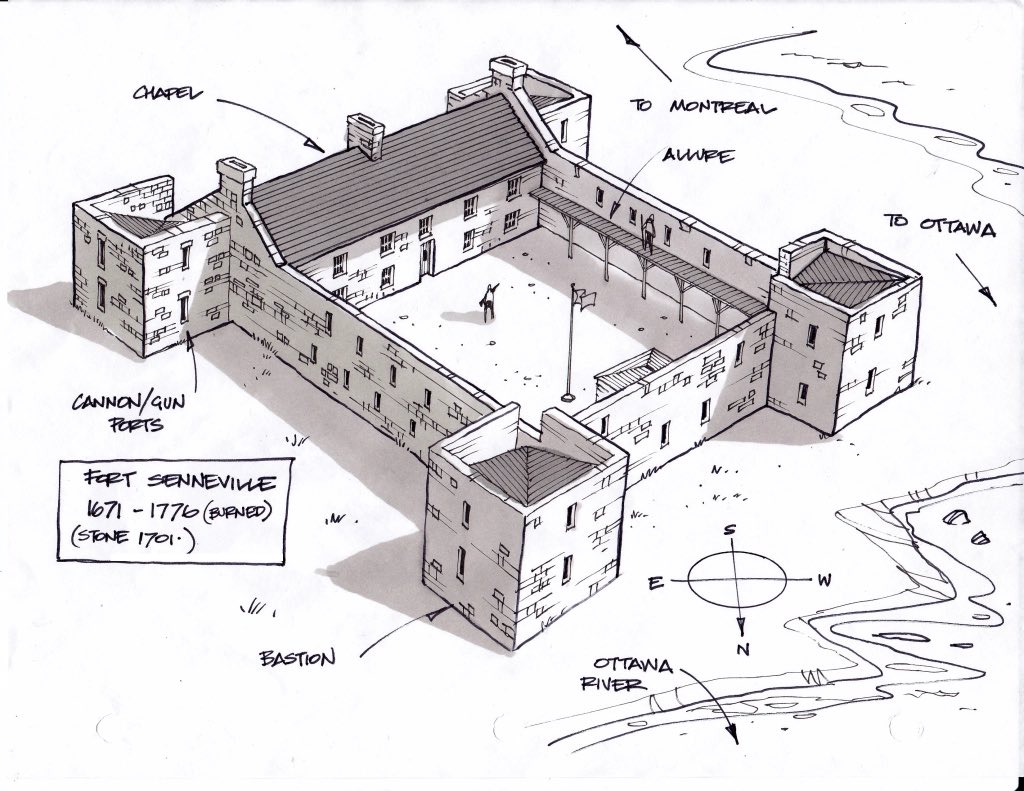 I have drawn what the fort may have looked like based on the archeological map layout and the description of other structures of that time period.