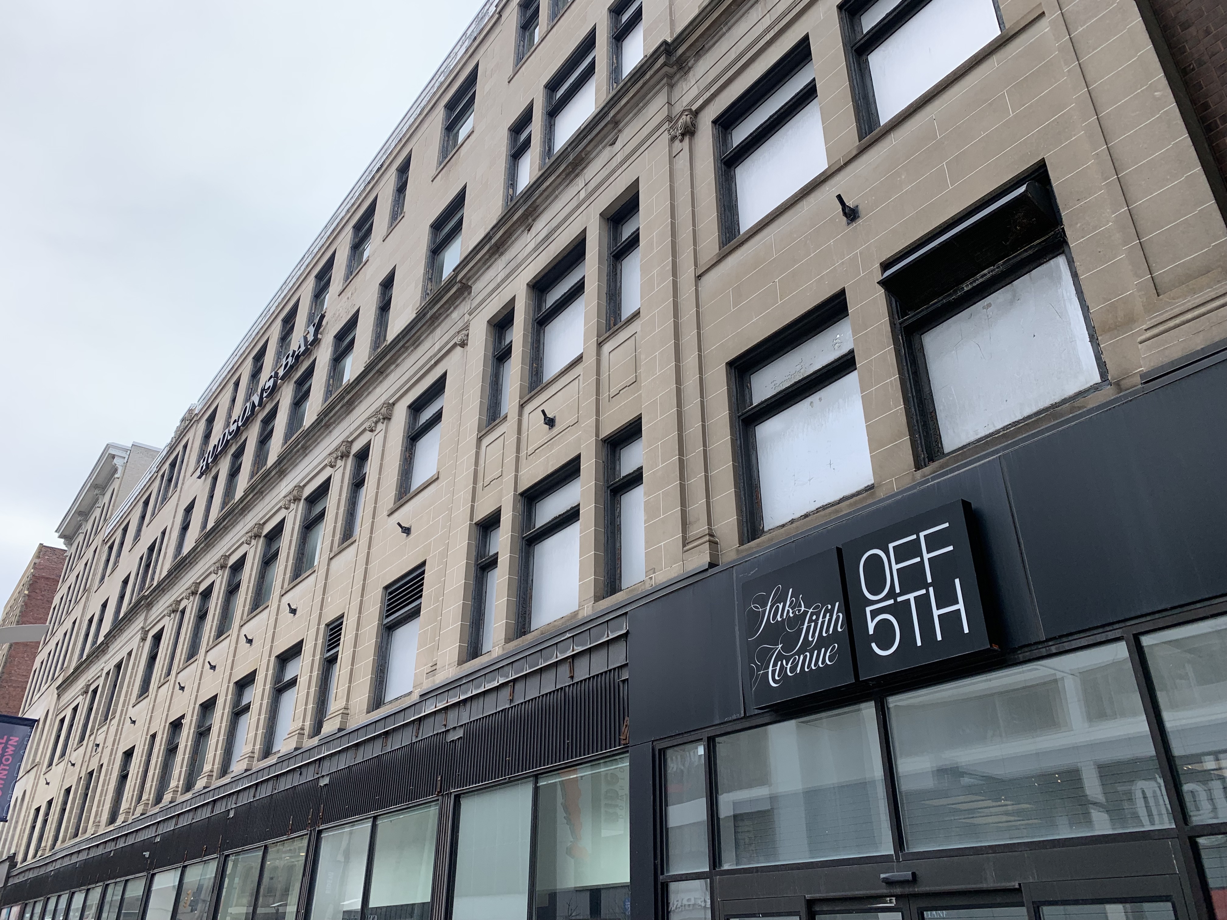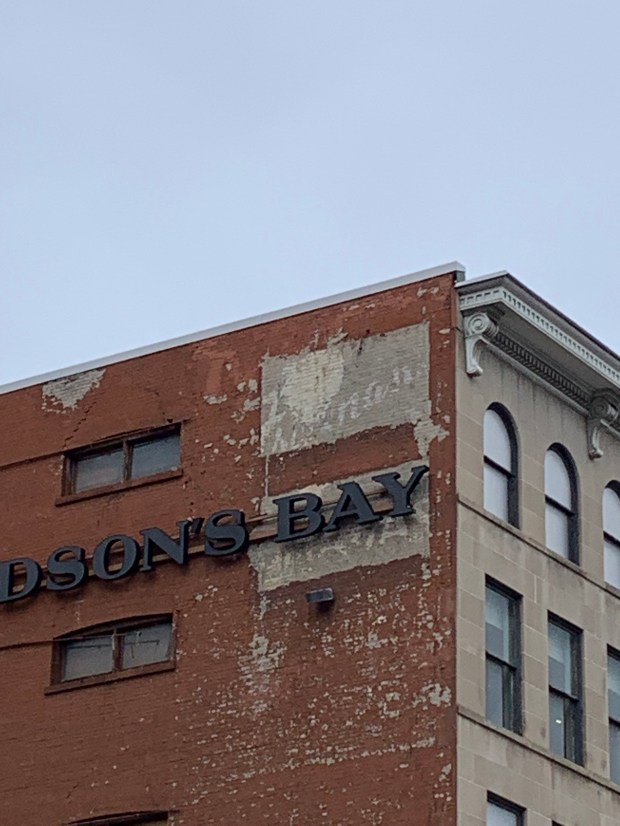 The only remaining signage indicating the past Freiman’s Department store is the fading painted letters on the brick wall behind the Hudson’s Bay sign.