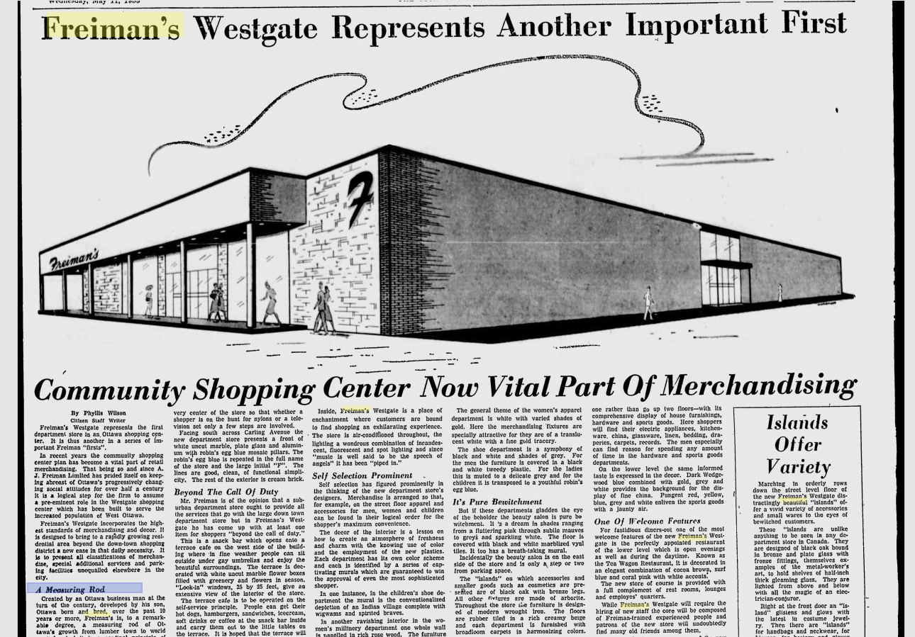 Westgate Shopping Centre opened May 12, 1955, and is considered Ottawa’s first shopping centre. The anchor of the mall was the Freiman’s department store, owned by Lawrence Freiman who already operated the department store on Rideau Street with its brand new escalators.