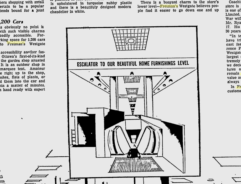 In advertising for its grand opening, Freiman’s new Westgate store boasted that it had parking for over 1200 cars, weather-protected shopping and music for its customers as well as an “escalator to our beautiful home furnishings level”. That escalator from 1955 would make it Ottawa’s THIRD Oldest escalator.