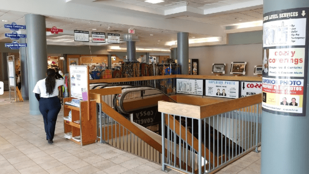 Upon entering what would have been Freiman’s at Westgate is the eastern most entrance to the mall and the escalators that had been there since 1955 are now boarded up and concealed by an advertising wall.