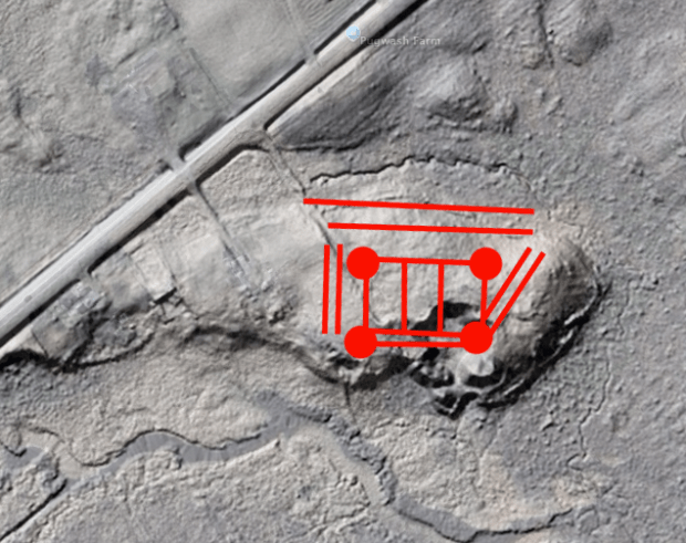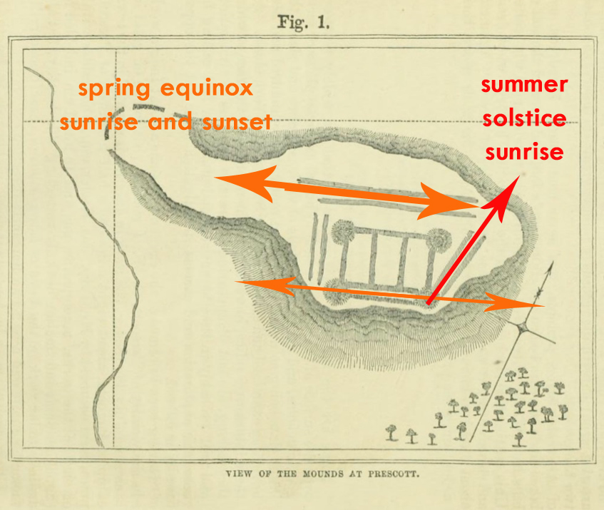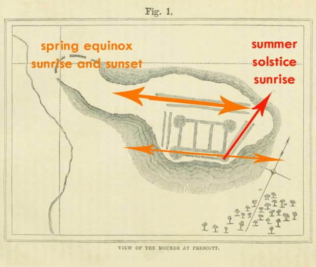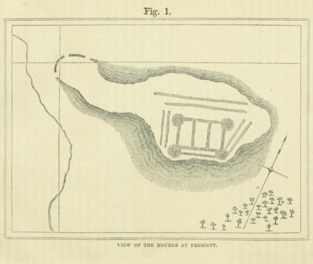 A representative from the Smithsonian, a Mr. Guest is sent to Canada, specifically Prescott, Ontario to investigate what seems to be a large earthworks formation resembling an ancient fort. Mr. Guest arrives from Ogdensburg, NY. He describes the first site as being “eight miles and a half northwest of Prescott” and containing “mounds and embankments.” He then mentions the presence of four mounds arranged in a rectangle formation, which contain between one and two acres of ground. He says the mounds were up to four feet high. Guest sketched the formation: