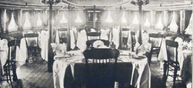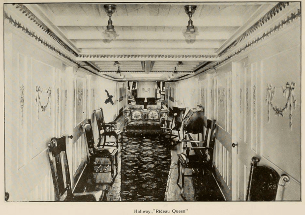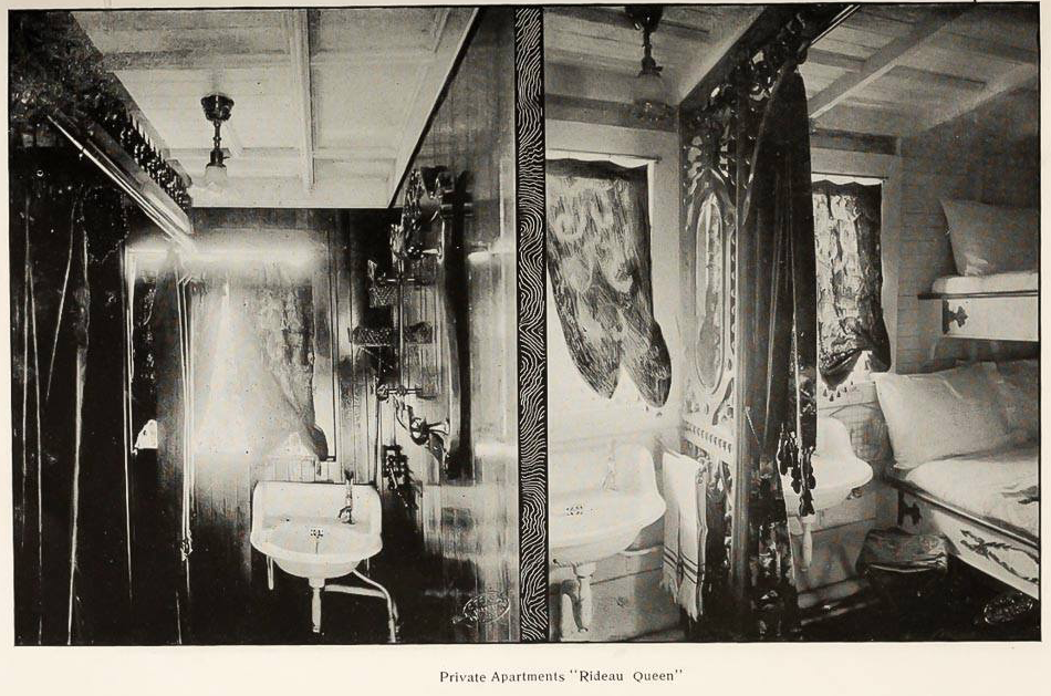 Ads in newspapers would boast that the latest Rideau steamship had “steam heat, electric lighting, electric fans, and cabins priced from $1.00 to $5.00, with meals at 50cents, and “lavish marble wash basins”.