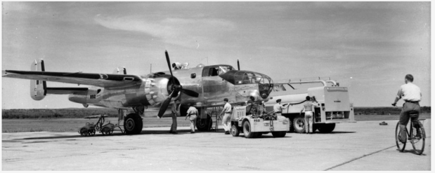 After World War Two ended in 1945, many of the aircraft that were in service moved on to other roles in the 1950s. This included the North American B-25 Mitchell, an American medium bomber that was introduced in 1941 and used by many Allied air forces during the war. The B-25 served in every theatre of World War II, and many remained in service in the post-war period.