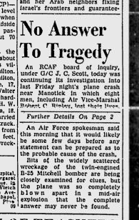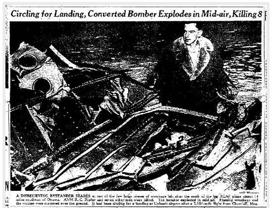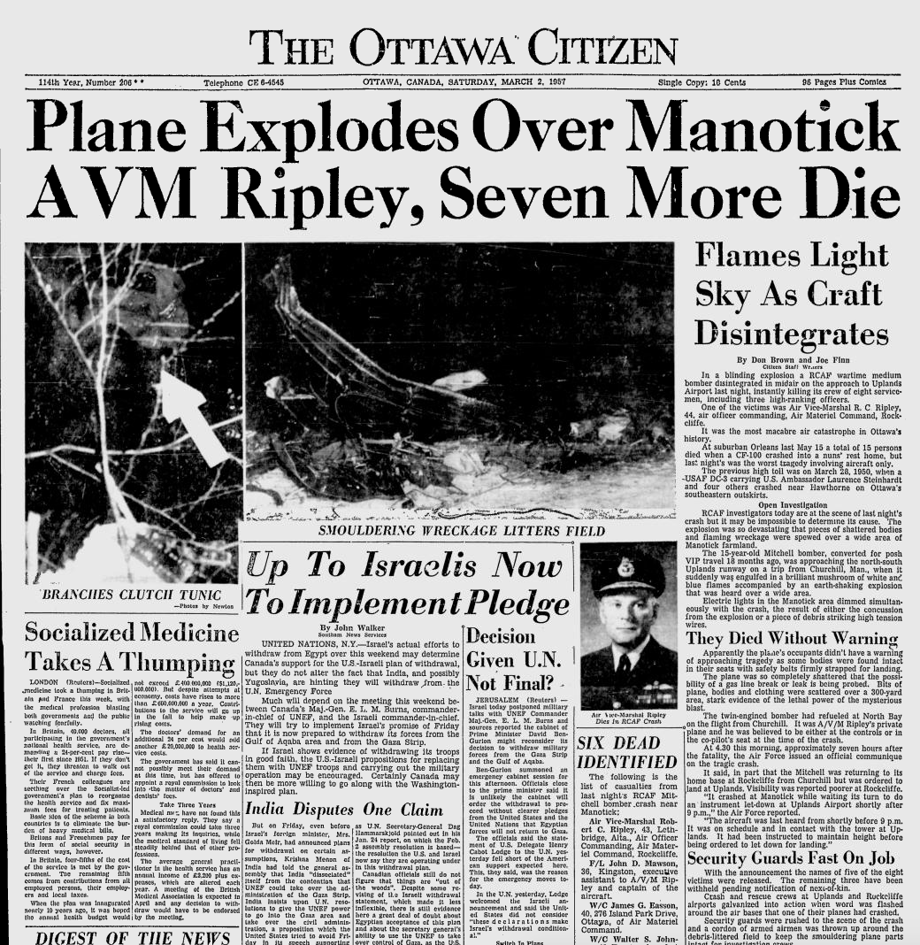 Witnesses in Manotick said that the plane was sputtering and then in blinding flash, exploded in mid-air, hurtling to the ground and exploding in a second fireball that rained aircraft fragments throughout the farm field where the tragedy occurred. Eight people aboard died that fateful night in 1957, including Air Vice Marshal Robert Ripley, Commander of the Air Material Command. Also lost that night in the explosion were: