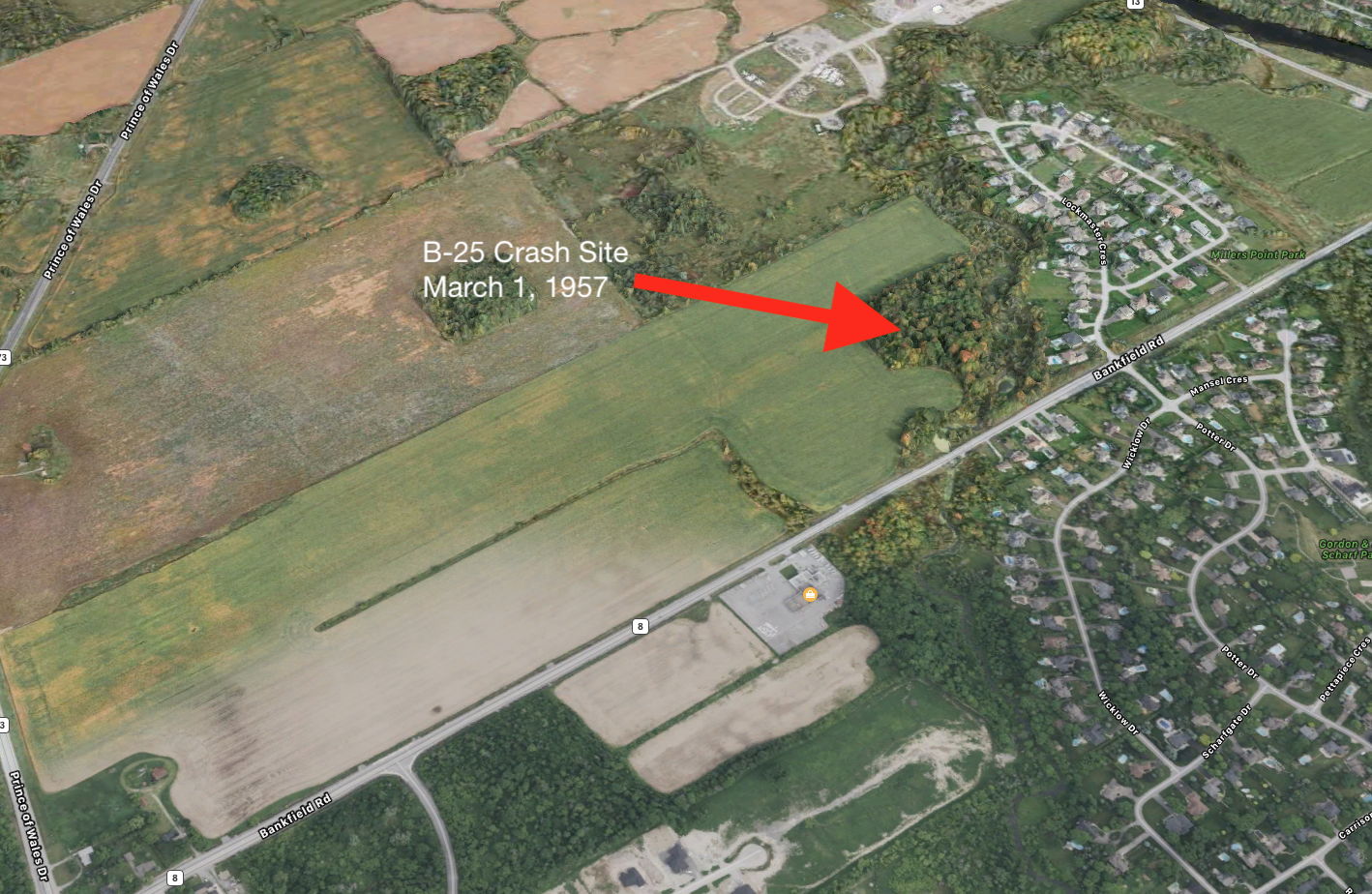 With bad weather engulfing the Ottawa area that night, the B-25 was advised to land at Uplands instead of Rockcliffe. As the plane made its descent to land at Uplands, it suddenly and unexpectedly exploded in mid-air, with a blinding white light flashing over the small village of Manotick southwest of Uplands airfield.