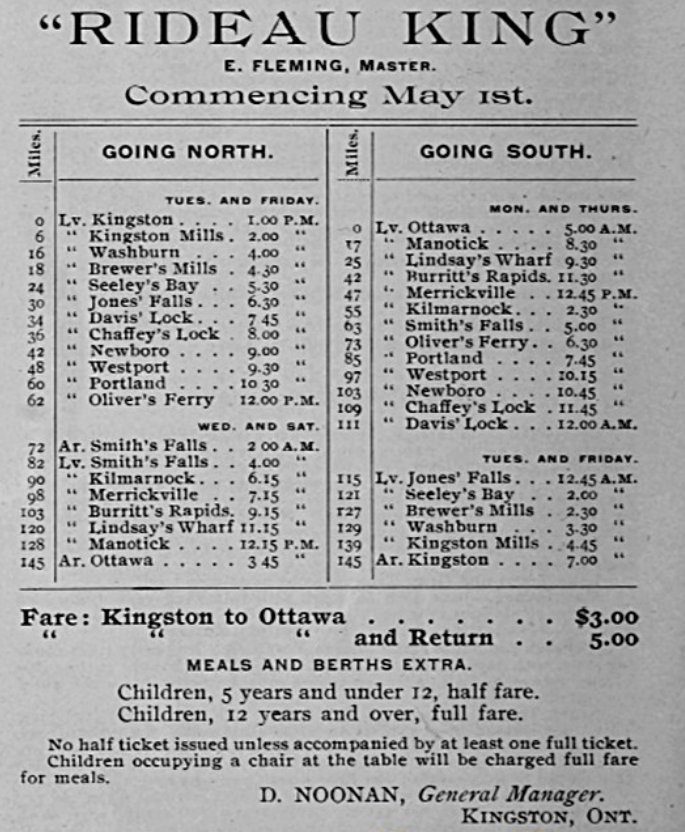 Starting services on May 1st, 1902 as the Rideau King, Capatian Noonan’s newly restored steamship offered round trip service from Kingston to Ottawa for $5.00 ($3.00 one way) with meals and berths extra, leaving Kinsgton at 1pm and arriving in Ottawa at 3:45pm the next day.