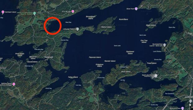 Sand Lake and the bay, West Bay, where Rideau Belle burned in 1895. (Google Maps)