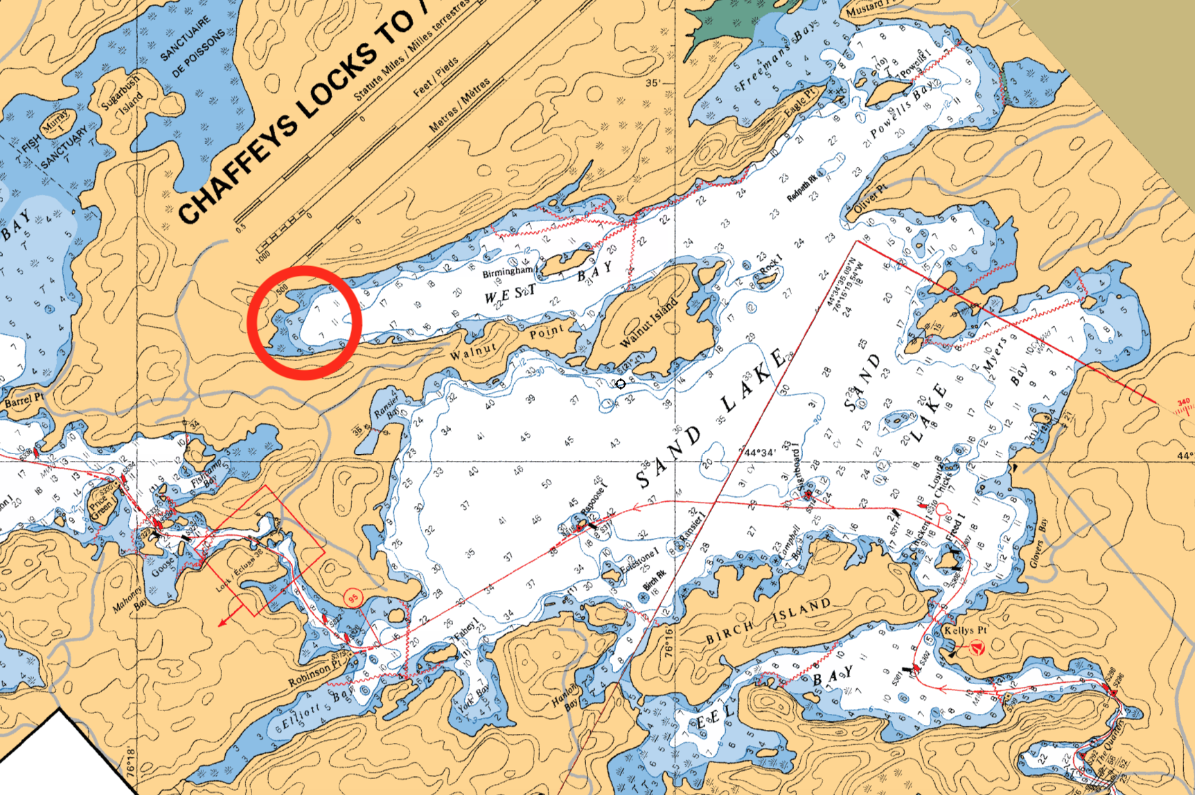 A nautical chart showing the bay where Rideau Belle burned, but no indication of a wreck marked.