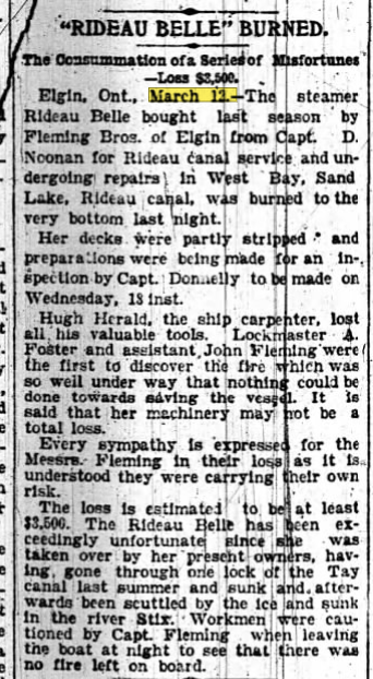 According to an article I found in the Ottawa Journal from March 12, 1895, on Page 7, it states the “THE RIDEAU BELLE BURNS”…Anchored for over-wintering in a bay of Sand Lake on the Rideau system, a fire somehow broke out and burned her hull to the waterline. The Rideau Belle met her final fate on Sand Lake and it seems her service was over, but where did she sink on Sand Lake?