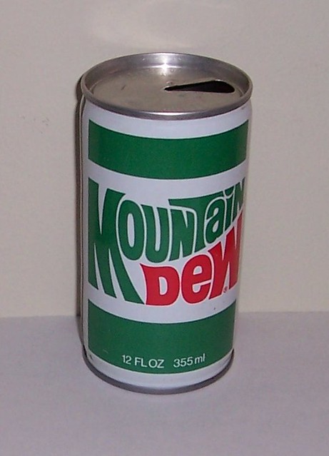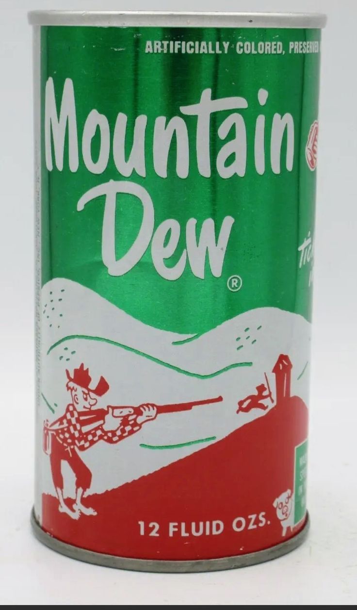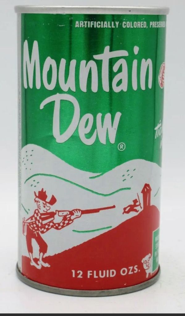 The re-designed 1969-70s Mountain Dew packaging, a logo design that would last until 1996.