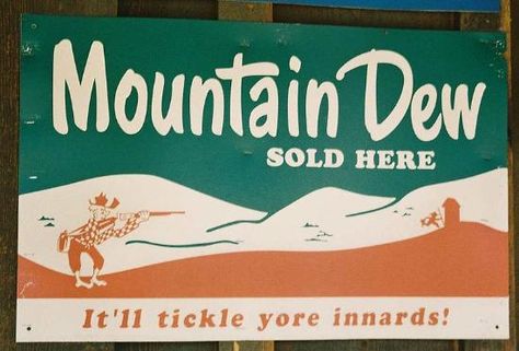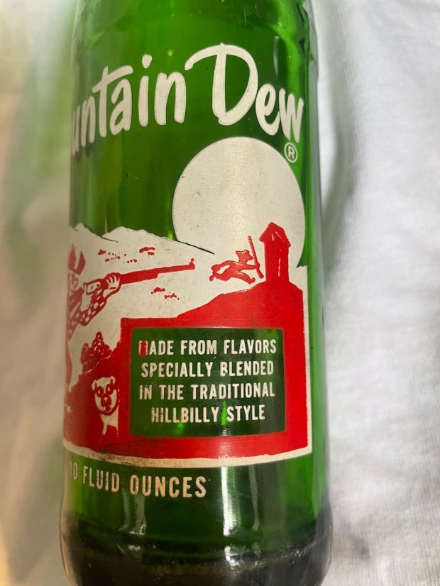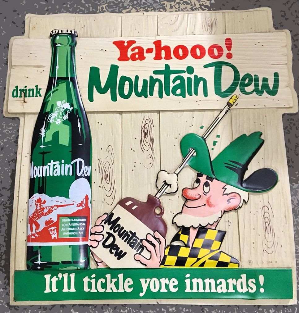 Under Pepsi, Mountain Dew was marketed as a “Hillbilly” drink and branded the bottles with a design and the motto “It’ll tickle you inards!”